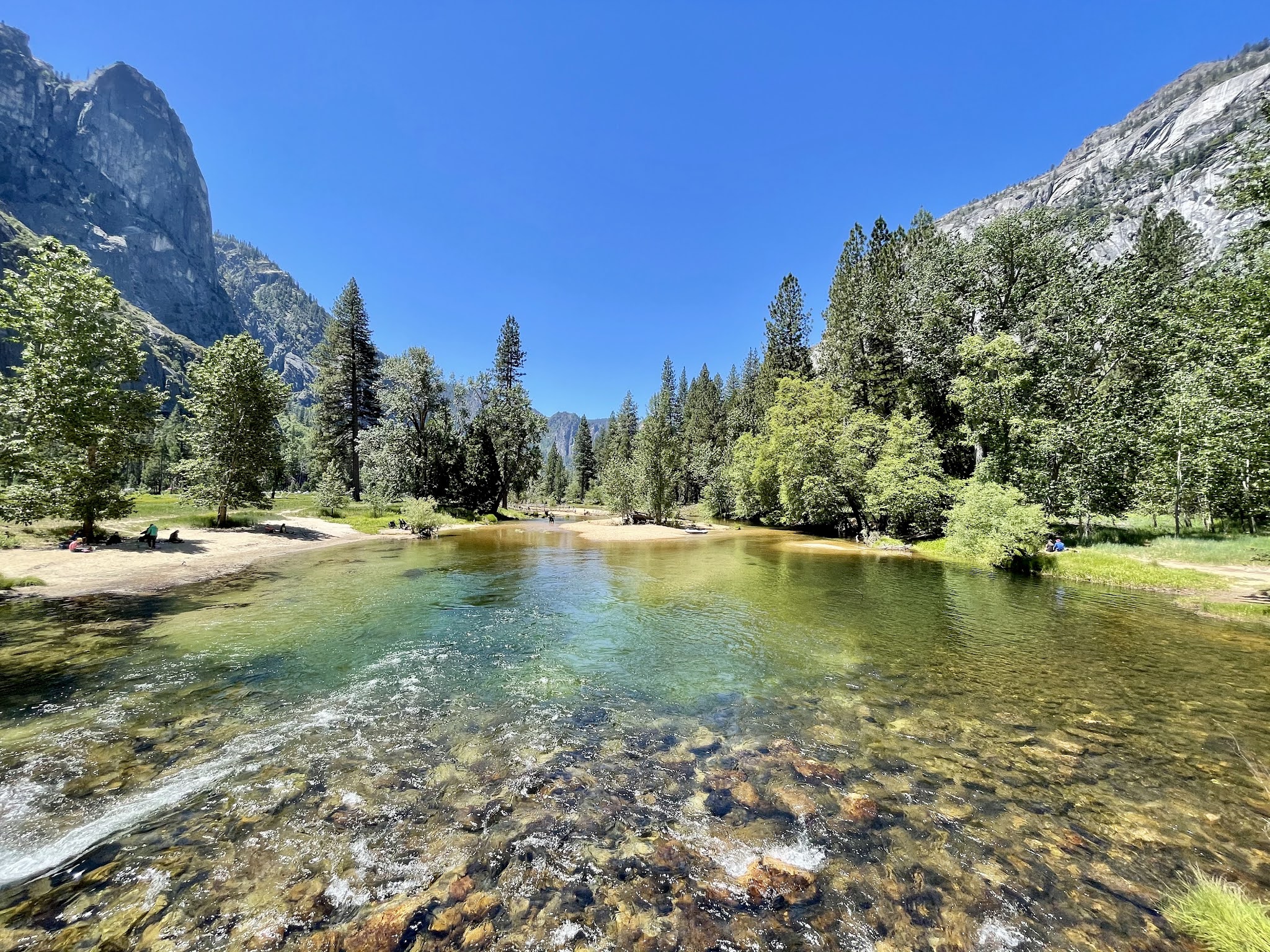 第二天,我们同样一早就来到公园,依然把车停在酋长岩旁的路边。 下车后,我们沿着一条小路朝哨兵桥走去。 我们静静地走在优胜美地谷地,四周绿意盎然大树参天,清澈溪流蜿蜒流淌,恢宏岩山倒映水中,在家躲疫情一年有余的压抑在这世外桃源得到释放。不一会,一座木桥出现在眼前,木桥横跨Merced 河流,不少孩子在河滩上嬉戏。我们站在桥上遥看飞流而下的优胜美地上瀑布和它在河中的美丽倒影。跨过哨兵桥,我们继续沿着河边行走,因为河水太少,我们希望找到一个能跨过Merced 河流的地方。有几个地方如果是年轻人就过去了,我们不敢冒险,于是只好原路返回,再一次跨过哨兵桥,回到哨兵草甸。